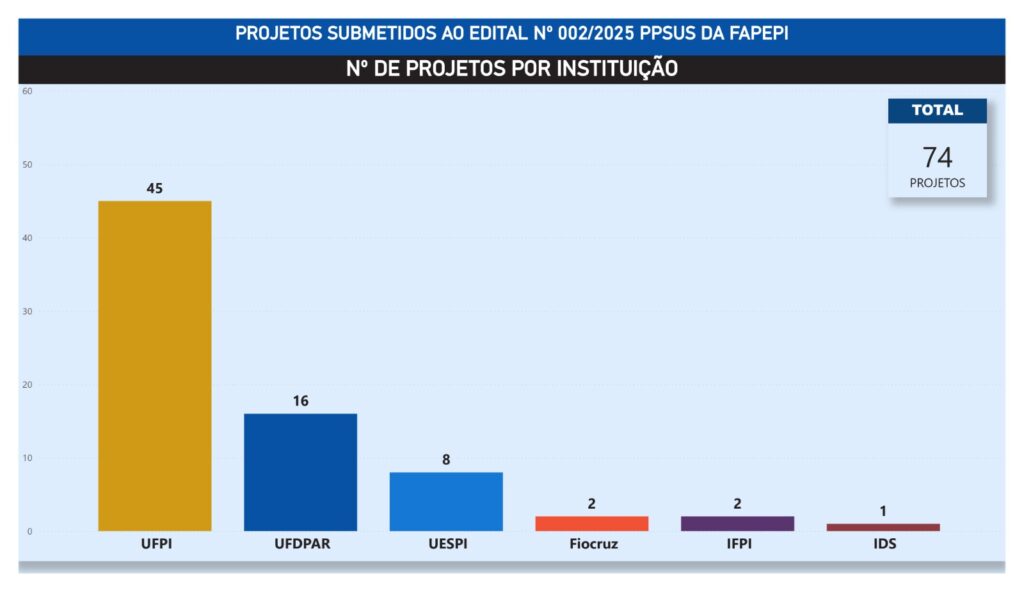 De acordo com os dados do Departamento Técnico Científico da Fapepi, os dados reforçam a consolidação do Piauí como um dos estados mais atuantes no programa. Entre as instituições com maior número de submissões estão a Universidade Federal do Piauí (Ufpi) e a Universidade Federal do Delta do Parnaíba (UFDPar), seguidas pela Universidade Estadual do Piauí (Uespi), a Fiocruz e o Instituto Federal do Piauí (Ifpi). O destaque da participação institucional revela o fortalecimento da rede de pesquisa em saúde no estado e o compromisso das universidades e centros de pesquisa com a produção científica voltada às necessidades da população.