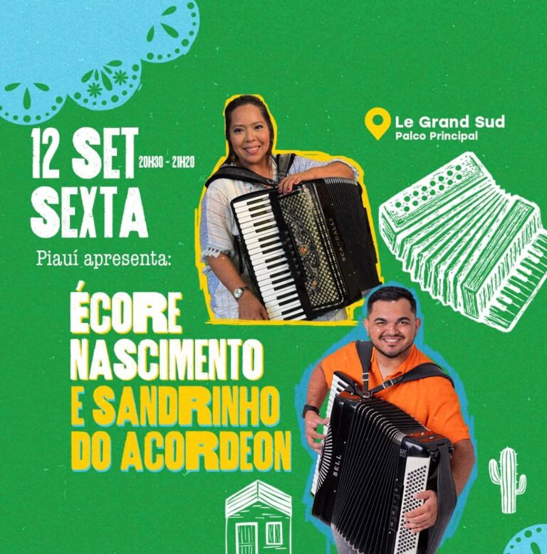 Nesta sexta-feira (12), o Piauí marca presença no palco do Le Grand Sud com os músicos Écore Nascimento e Sandrinho do Acordeon, reforçando a representatividade da cultura piauiense no cenário internacional.