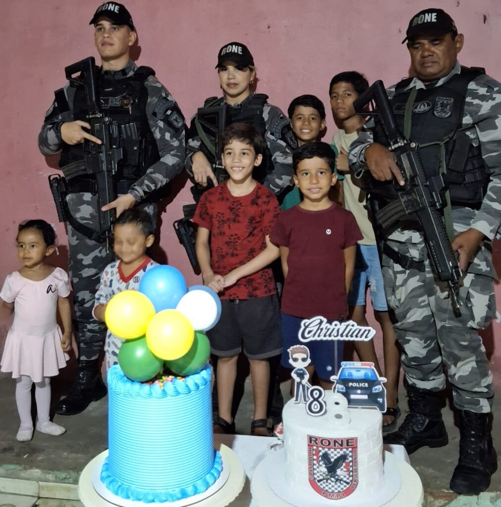 Uma ação emocionante marcou a noite de quarta-feira (15) no bairro Porenquanto, zona Norte de Teresina. O pequeno Christian, de 8 anos, recebeu uma visita especial no dia do seu aniversário: policiais do Batalhão RONE, da Polícia Militar do Piauí, compareceram à festa a pedido do próprio garoto, que é autista e tem grande admiração pela corporação.